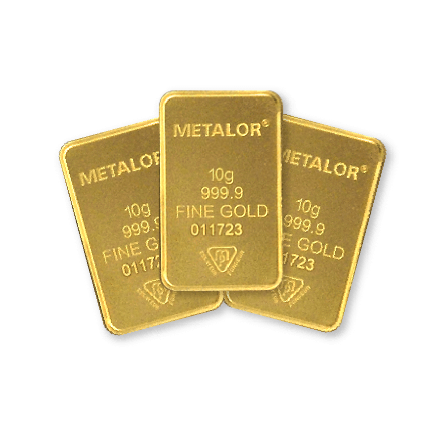 This is a bundle of 3 x brand gold bars, struck in 999.9 fineness 24 carat gold and is minted by Metalor. This bundle offers you a cheaper way to buy three x Metalor 10g Gold Bars.