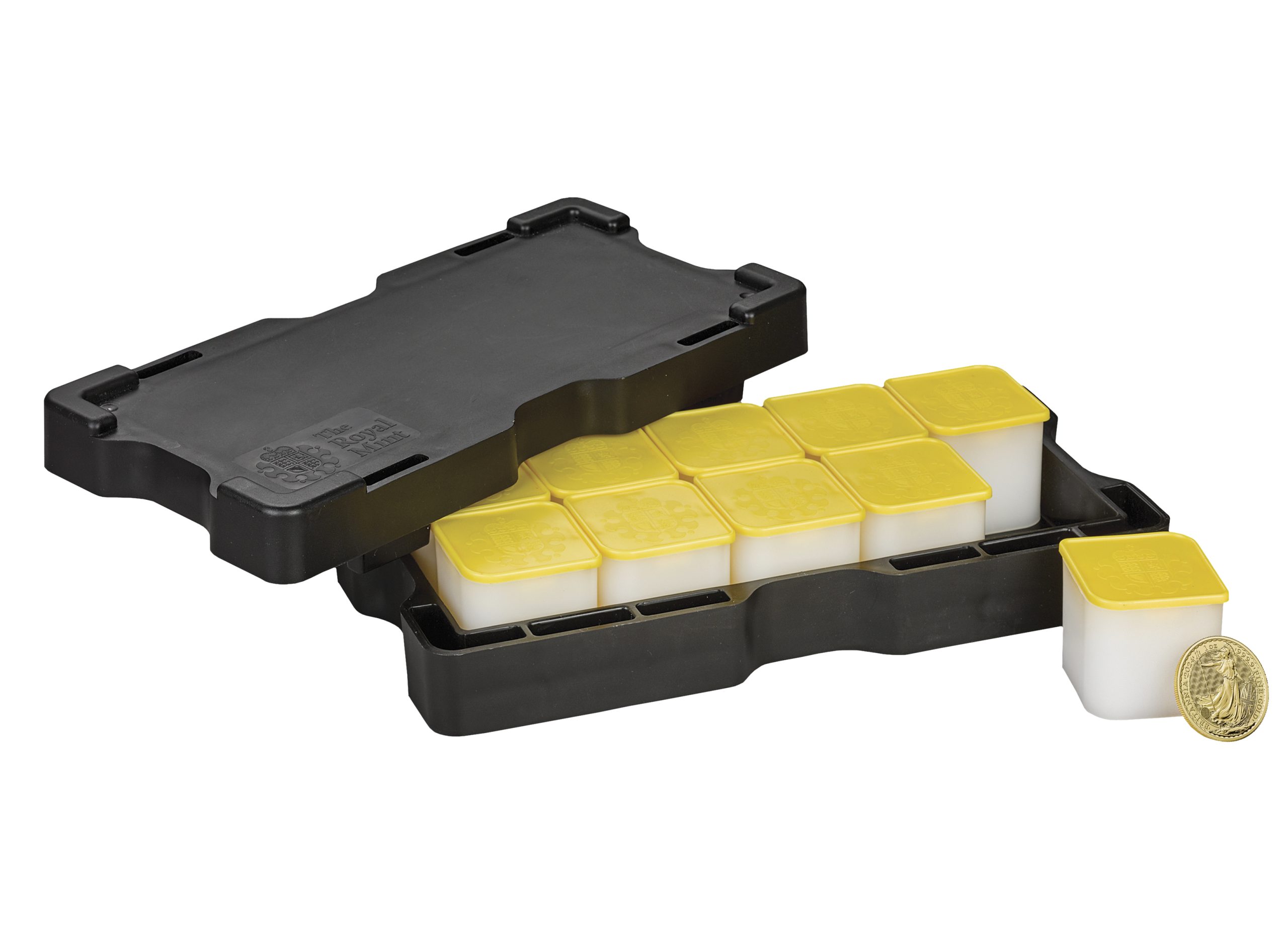 Struck in 999.9 fineness 24 carat gold, this Royal Mint coin is the first in a new era of ultra-high secure coins. The coins will come in a Royal Mint tube if bought in quantities of ten. Smaller orders will come loose, but the Britannia coin capsules can be ordered to protect them.