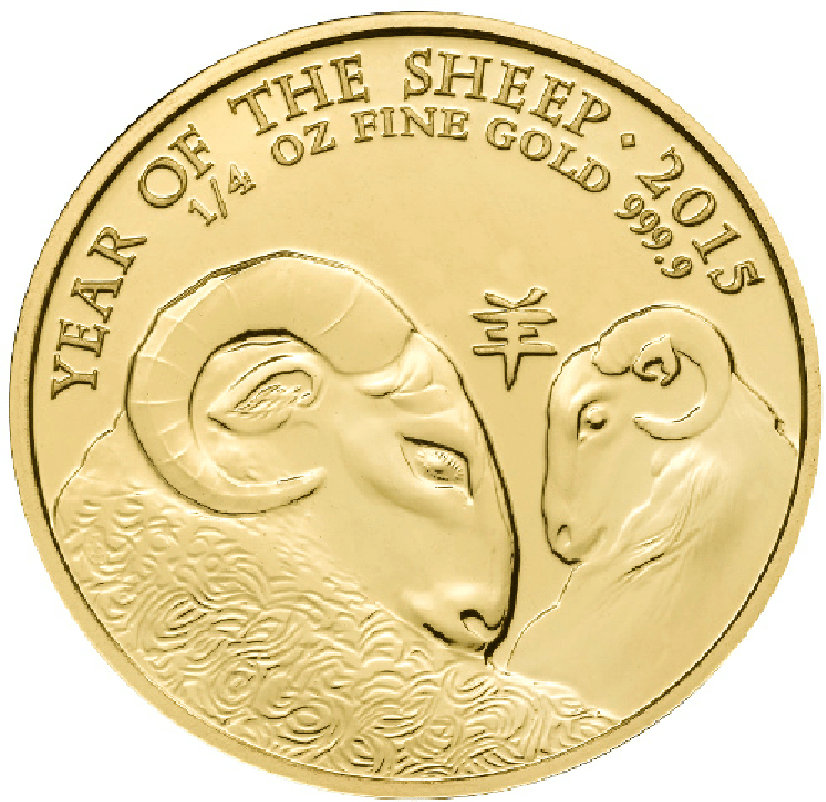 This gold quarter ounce Lunar Sheep coin from 2015 is the 2nd in the 12-coin Shengxiao Collection from Royal Mint, designed by artist Wuon-Gean Ho.