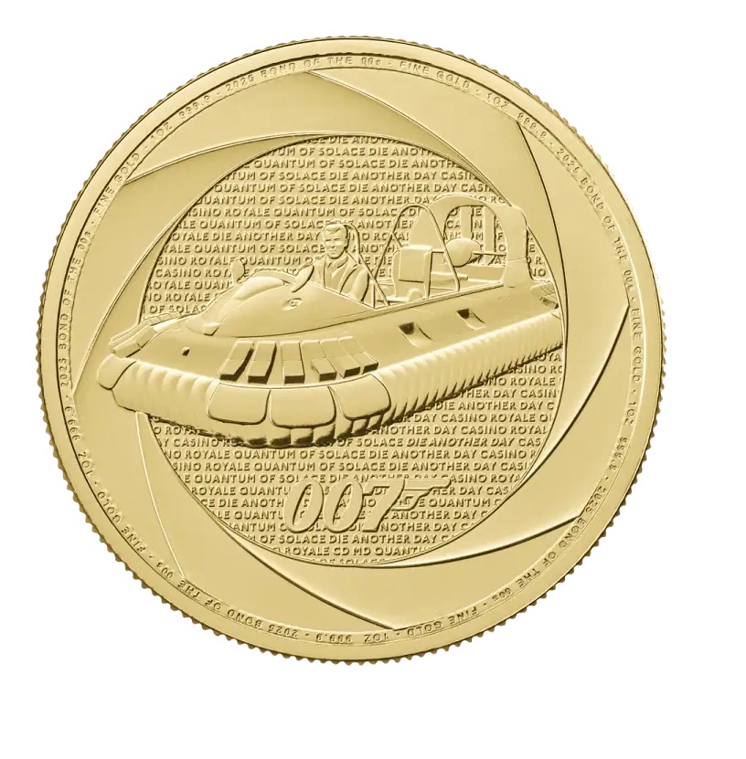 The reverse design highlights the hovercraft from the explosive opening of Die Another Day. Its inclusion pays tribute to the spectacular action sequences and cutting-edge stunts that defined the decade, while symbolising the franchise’s ability to evolve with time. The obverse features the official coinage portrait of His Majesty King Charles III by Martin Jennings.