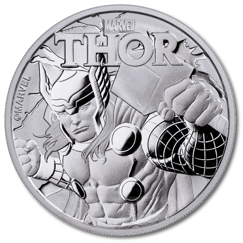This is a silver coin, limited in mintage to just 50,000 pieces. Each coin contains 1oz of silver, struck to 999.9 purity by the world-renowned Perth Mint. This is an official Marvel comics product, manufactured on behalf of the tiny Polynesian island of Tuvalu. The Thor silver 1oz coin is the second in a series of six coins celebrating Marvel superheroes. It follows the success of the Spiderman coin and joins the Black Panther coin. Coins are carefully released to capitalise on the Marvel movie releases of the same name. Like all our silver coins, we can exclusively deliver them VAT-free.