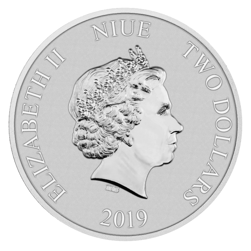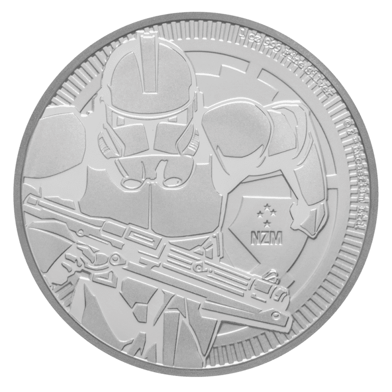 This is a silver coin minted by the New Zealand Mint.  Limited to a mintage of just 250,000, the 1oz silver coin is produced to a fineness of 999.0. With a face value of 2 NZ Dollars, the coin follows on from the popularity of the Darth Vader coin. Coins come in tubes of 25 and boxes of 250.