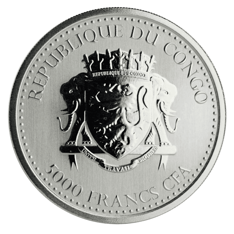 The obverse features the Congolese Eastern Lowland Silverback Gorilla image. Arguably the Congo’s most famous fauna, the Gorilla roams the forest near the border with Rwanda.