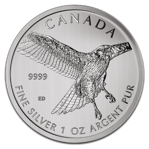 The reverse of the coin showcases the magnificent Hawk swooping down towards its prey. The detail achieved in the bird’s feathering is particularly impressive. The wording ‘Canada’ is displayed above, while the ‘1oz Fine Silver argent pur’ confirms the weight and metal below.