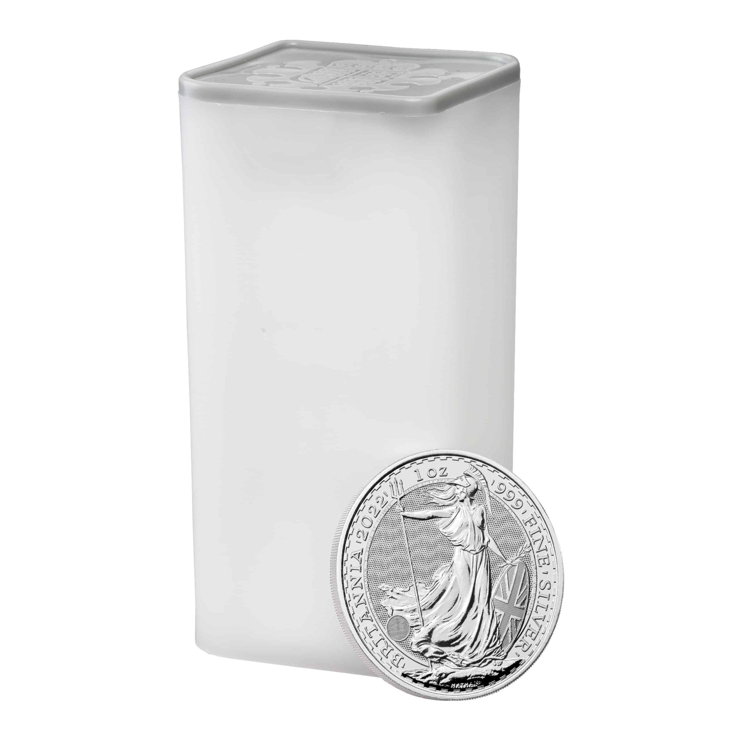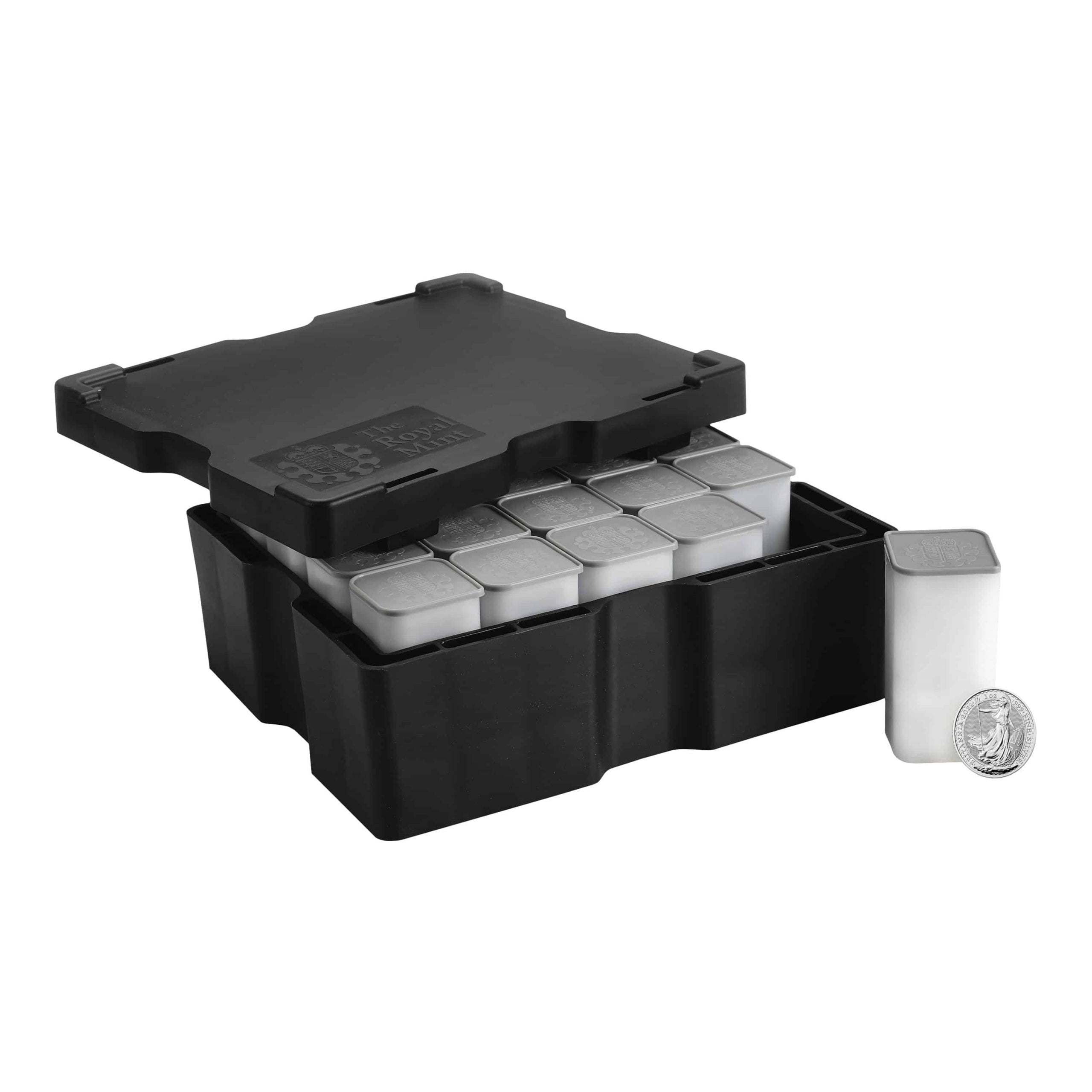 This is a brand new silver bullion coin from The Royal Mint. The minimum order quantity is 25 coins, with multiples of 25 coming in Royal Mint tubes, and quantities of 500 packaged into monster boxes, consisting of 20 tubes. These boxes provide an excellent storage solution for stacking larger investments of silver coins.