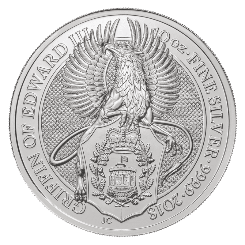 Joining the other 10oz silver Beast coins of the Dragon, Lion and Unicorn, the 10oz Silver Griffin appeals to those keen on owning every coin in the set. As a silver collectors coin, this coin’s immense size and design appeal greatly. This demand also supports prices for silver investors. As a UK Royal Mint coin with a face value, investors like this coin as it’s free from Capital Gains Tax. A huge advantage over non-UK coins or silver bars. The coin is minted to bullion standard rather than proof finish which lowers the price of the coin. The coin’s value is further increased by its huge stature. This reduces the relative production cost when compared to smaller 1 or 2oz silver coins.