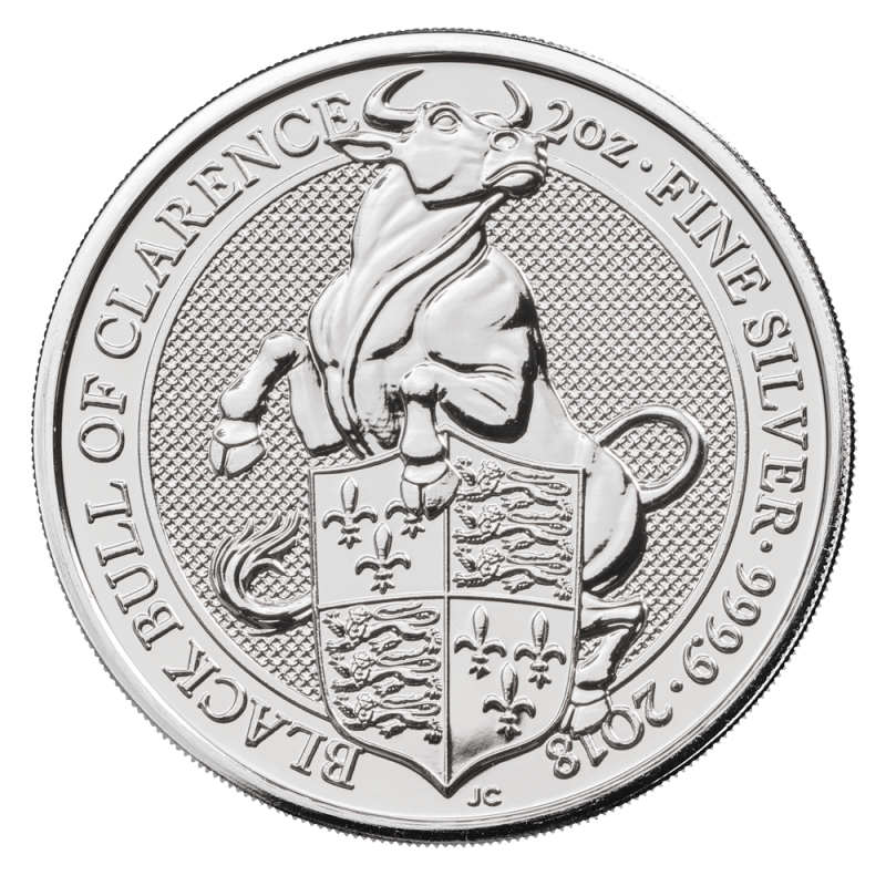 The reverse is Black Bull of Clarence holding a coat of arms and the words ‘BLACK BULL OF CLARENCE-2oz-FINE SILVER-9999-2018’.