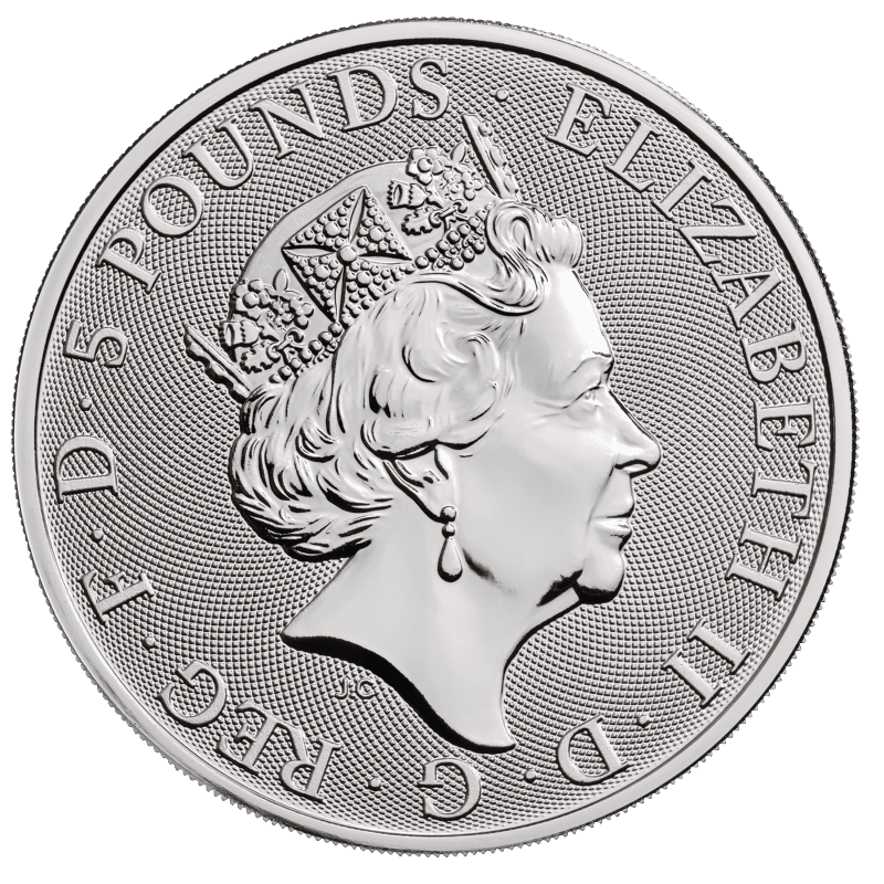 This exciting new coin is struck to 999.9 purity silver and contains 2oz of the precious metal. Being larger than the standard 1oz silver coins allows for detailed coin design. With a face value of £5 Sterling, the coin qualifies as UK legal tender. Rather than use it to purchase goods, buyers benefit from legal tender coins being free from Capital Gains Tax, so any profits made are tax free. Coins are produced to bullion finish so they benefit from great value.