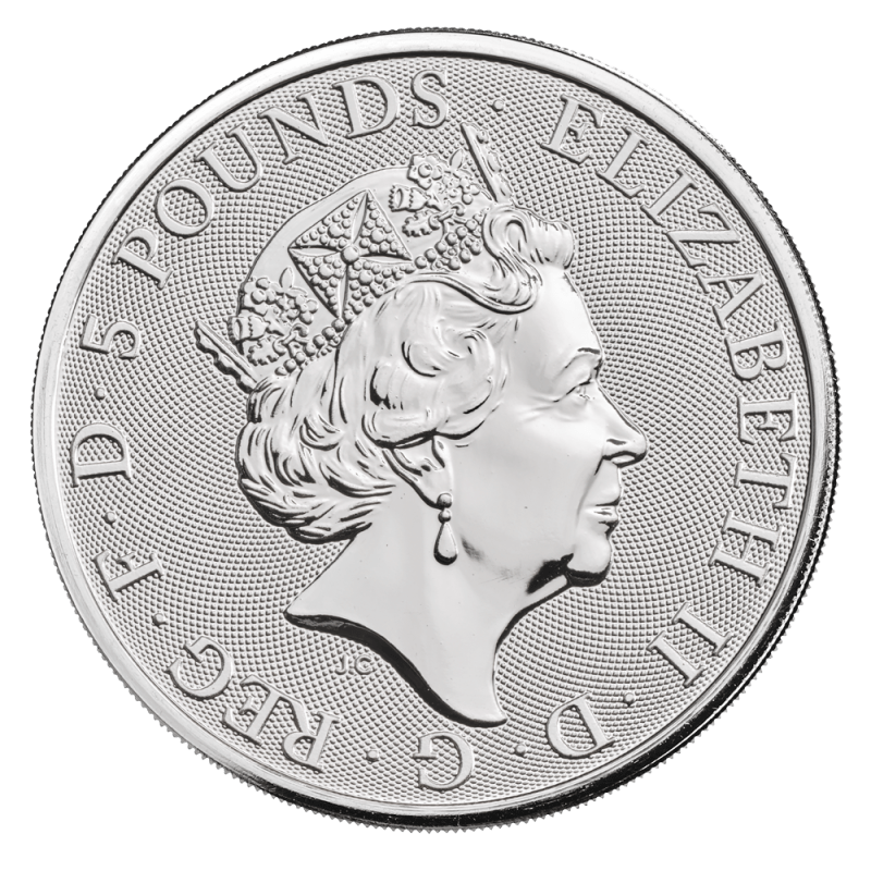 This exciting new coin is struck to 999.9 purity silver and contains 2oz of the precious metal. Being larger than the standard 1oz silver coins allows for detailed coin design. With a face value of £5 Sterling, the coin qualifies as UK legal tender. Rather than use it to purchase goods, buyers benefit from legal tender coins being free from Capital Gains Tax, so any profits made are tax free. Coins are produced to bullion finish so they benefit from great value.