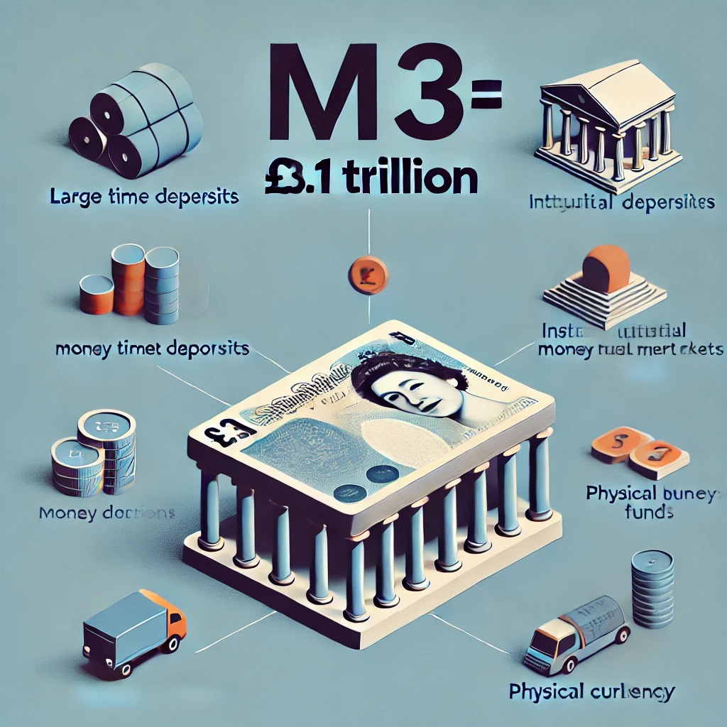 M3 is the broadest measure of money supply, incorporating M2 along with larger, less liquid financial instruments, such as institutional money market funds and long-term deposits. Though not as widely used in the UK today, M3 provides a more comprehensive view of all money in the financial system, including longer-term holdings.